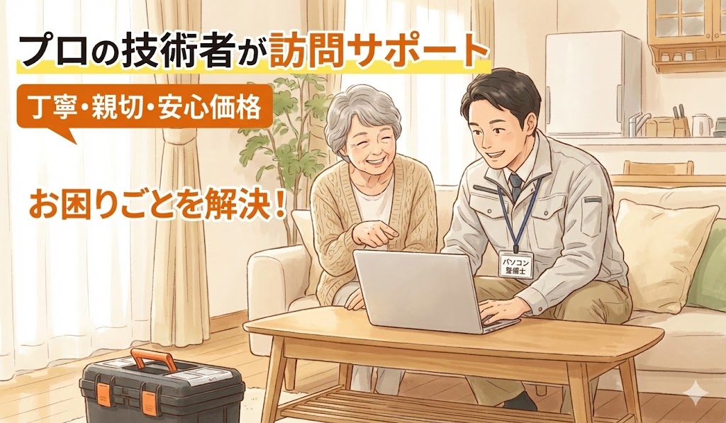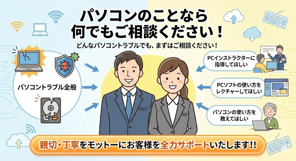 パソコン整備士の資格を持つプロの技術者が、丁寧・親切・安心価格でパソコンのトラブルを訪問サポートにて解決します。故障だと思って修理が必要な場合でも、パソコン専門の正社員が正しい操作をすることで、修理せずにトラブルが解消することも多くあります。