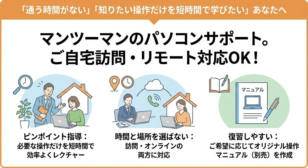 パソコンの基礎から、ソフトの使い方、トラブル予防のコツまで、目的に合わせてカリキュラムを調整。はじめての方でも安心してご利用いただけます。