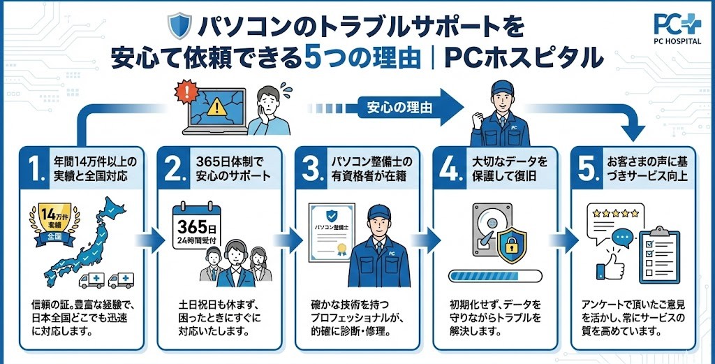 年間14万件以上の対応実績を持つPCホスピタルのパソコン整備士有資格スタッフが訪問し、確実な初期設定・各種設定・トラブル予防を実施。万が一の際も、データを保護しながら復旧・最適化まで丁寧に対応します。