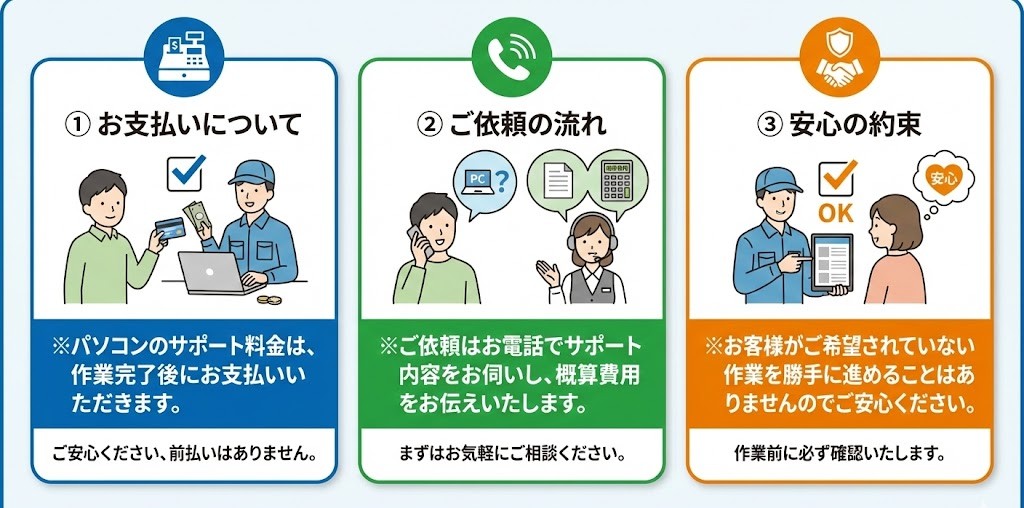 事前予約にて深夜の出張対応も可能です。「パソコンが起動しない」「ネットに繋がらない」など、急なトラブルも迅速に解決します。