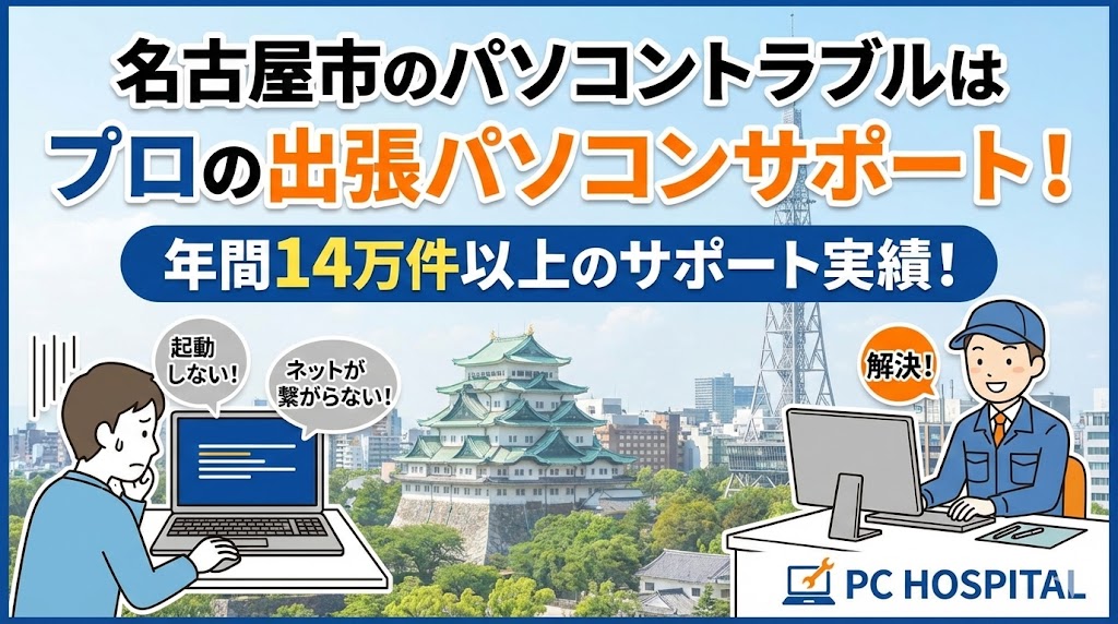 名古屋市にお住まいの皆様、「パソコンが起動しない」「ネットが繋がらない」といった急なトラブルは、名古屋エリアで年間14万件以上のサポート実績を誇るPCホスピタルにご相談ください。