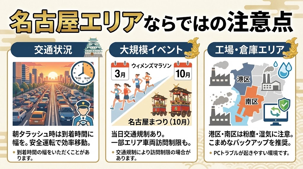 - イベント開催時:名古屋まつりやマラソン開催日は、交通規制エリアを確認の上、最適なルートで伺います。