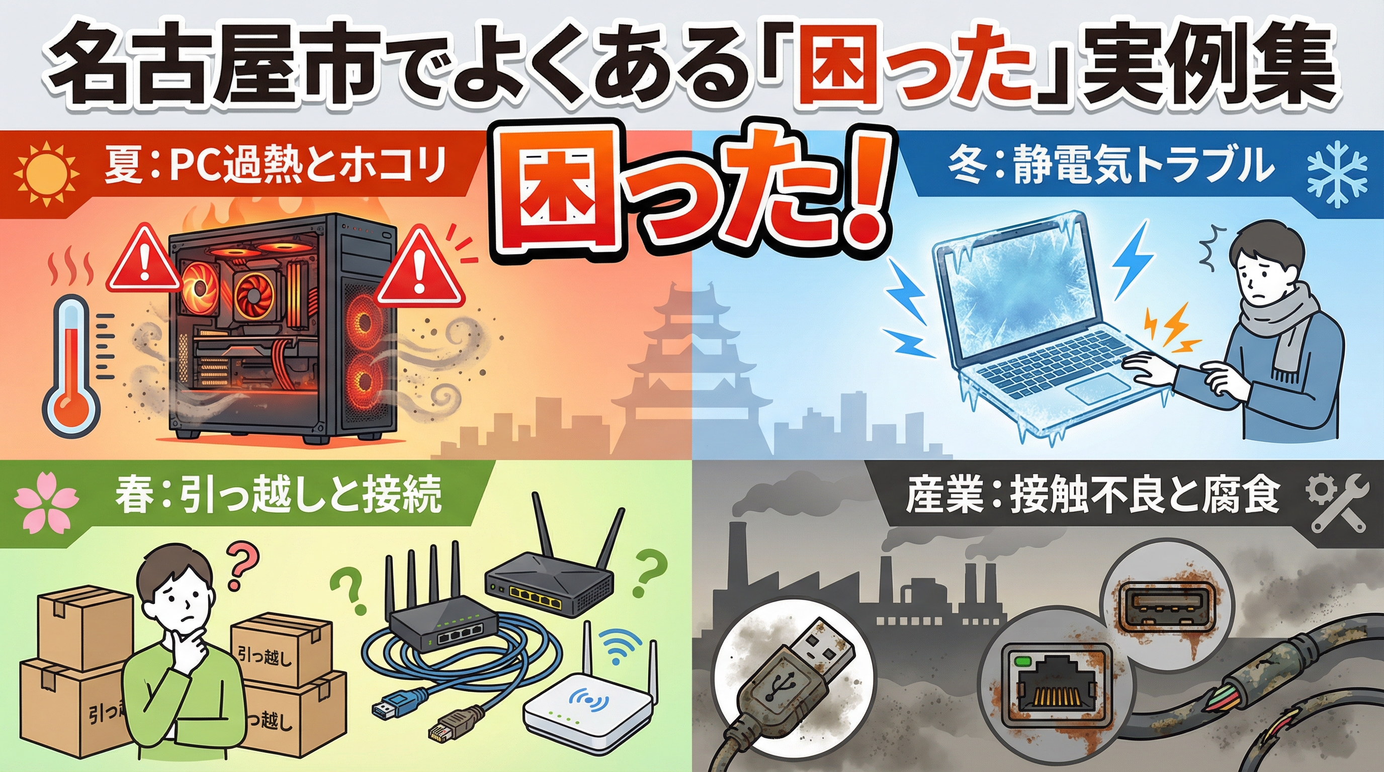 また、港区などの名古屋港周辺エリアには物流倉庫や工場が多く、粉塵や湿気による業務機器の接触不良トラブルのご相談をいただくこともあります。私たちは一般的な家庭用PCだけでなく、こうした特殊な環境下でのトラブル対応のノウハウも蓄積しています。