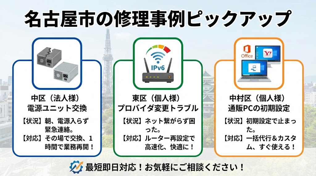 - 工場・倉庫エリア:港区や南区などの工業地域では、粉塵や湿気の影響でPCトラブルが起きやすい傾向があります。こまめなバックアップを推奨します。