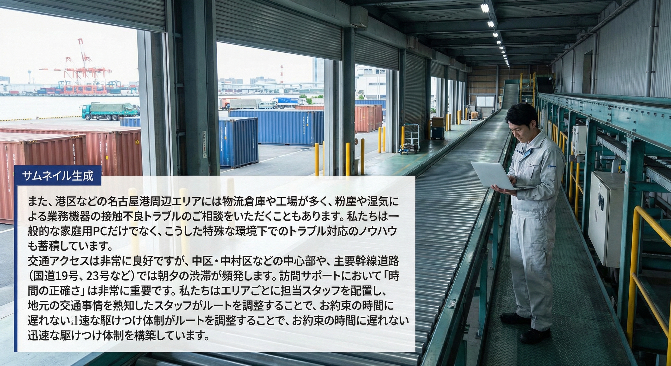 - 港区(名古屋港・金城ふ頭) — 物流拠点や工場が多いエリア。事務所のPCトラブルだけでなく、工場内のネットワーク配線などの特殊案件も対応可能。