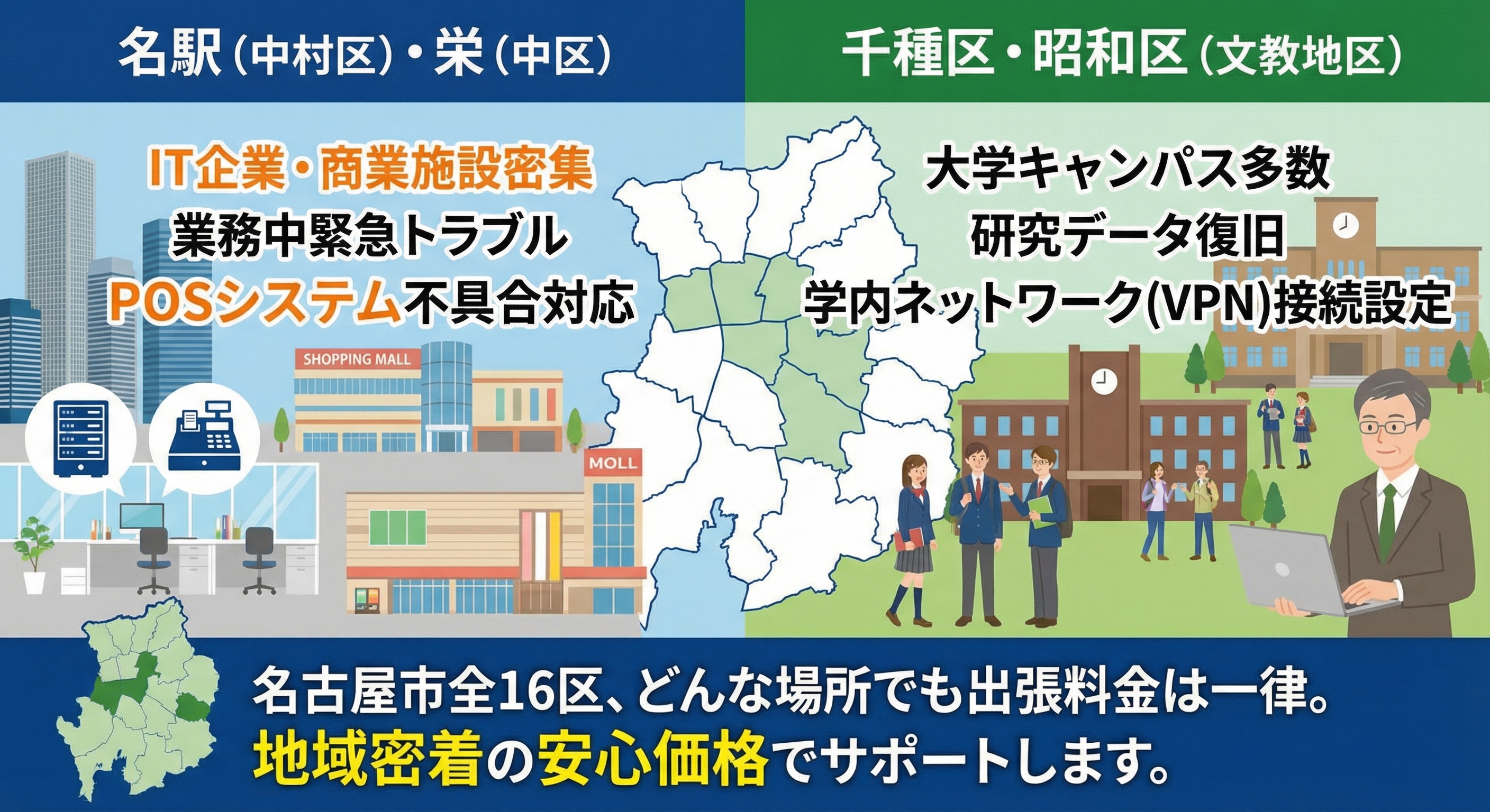 - 昭和区(八事・御器所) — 名古屋工業大学・南山大学を抱える学生街。春・秋の新学期シーズンは、アパートへの出張設定依頼が殺到します。