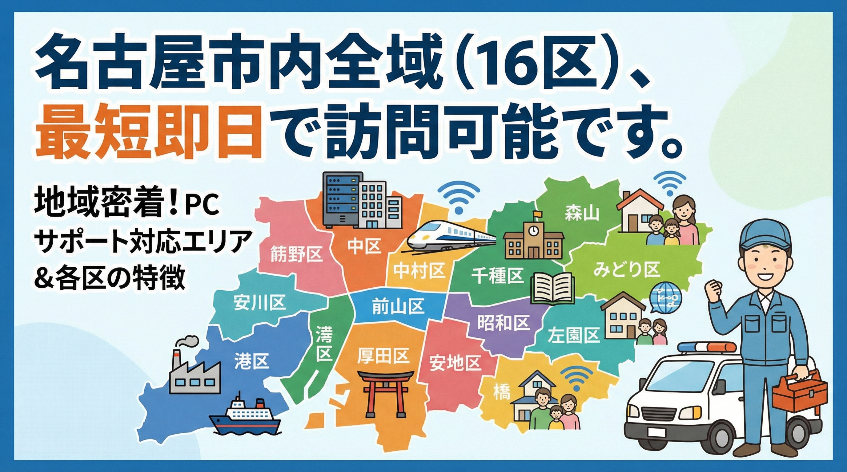 名古屋市内全域(16区)、最短即日で訪問可能です。