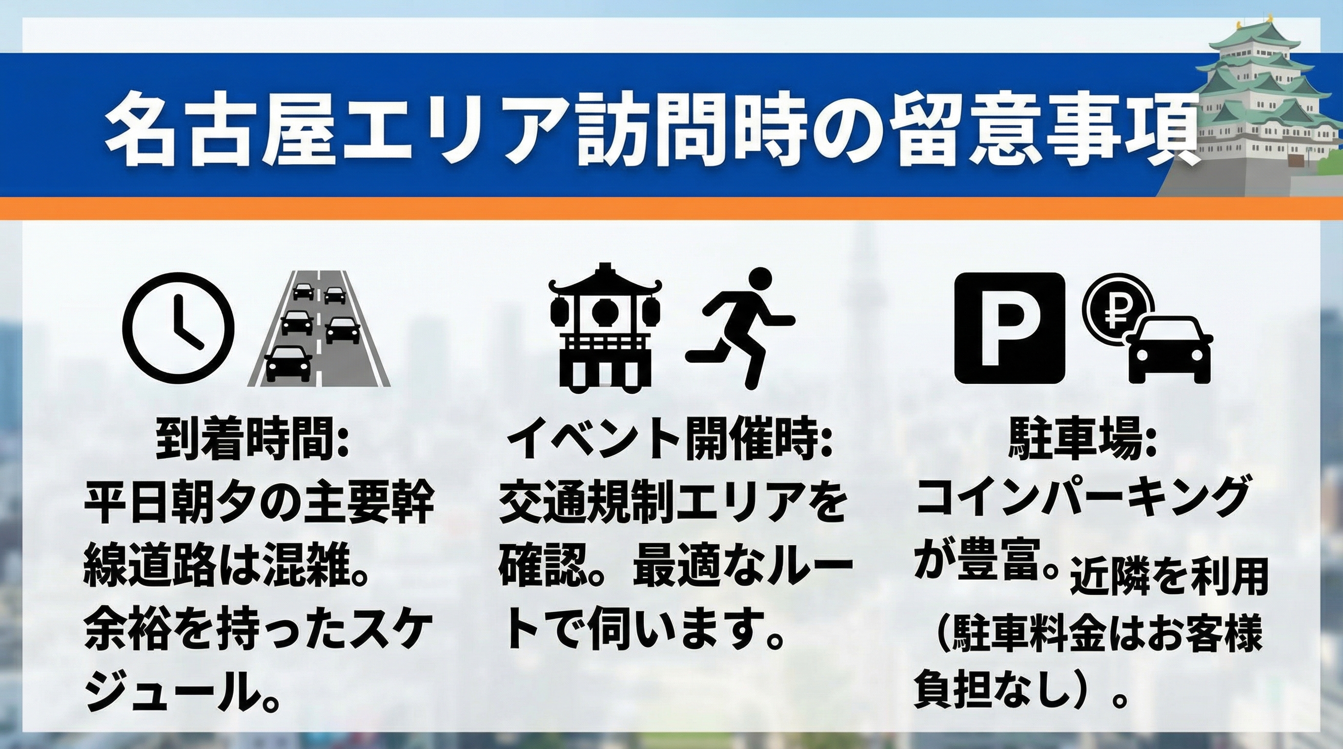 - 大規模イベント:名古屋まつり(10月)、ウィメンズマラソン(3月)当日は、交通規制により一部エリアへの車両での訪問が制限される場合があります。
